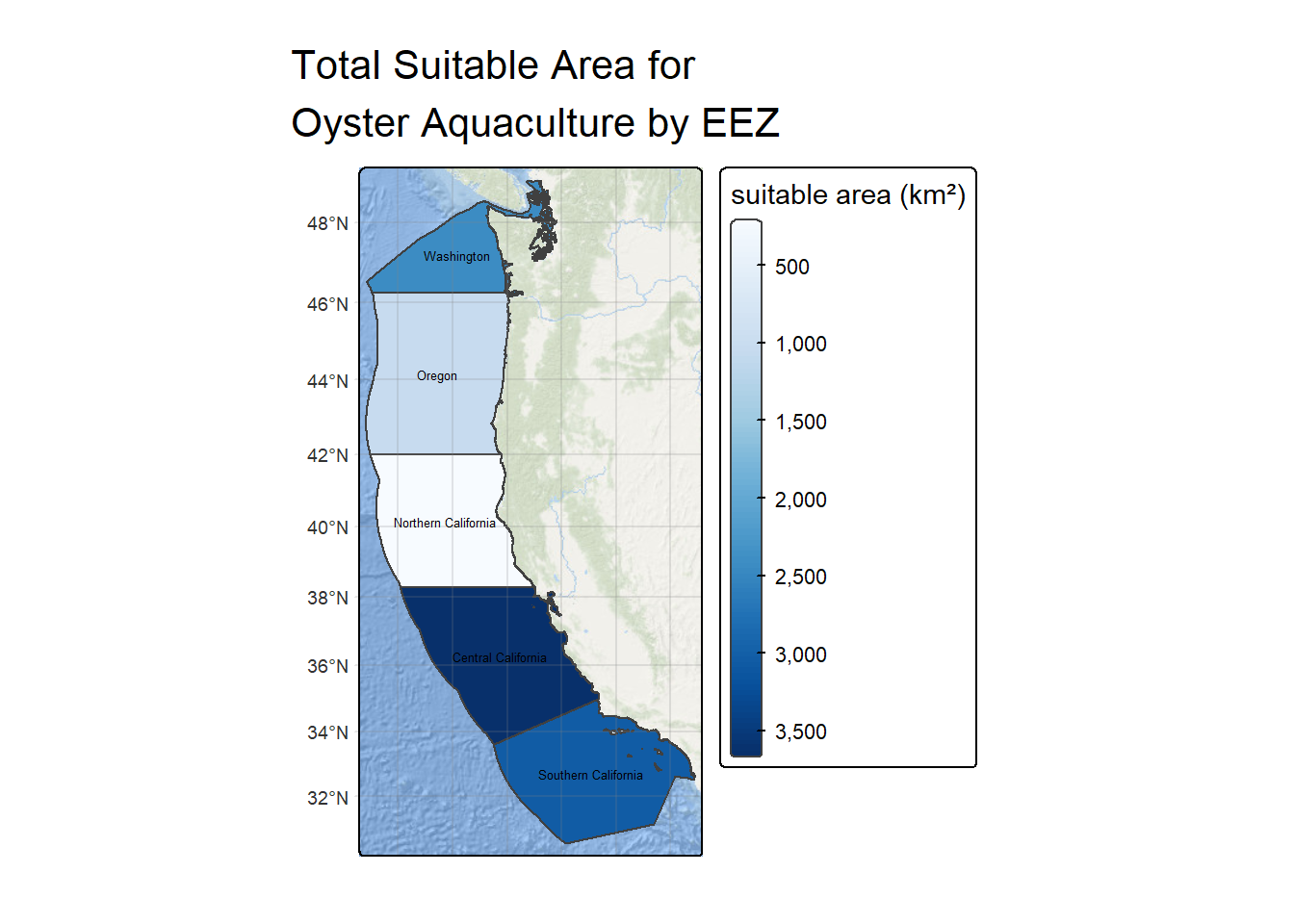 # Generalized functioneez_area_zone <-function(eez_data, depth_data, sst_data, min_temp, max_temp, min_depth, max_depth, species_name){# Make sure all CRSs match with the EEZ dataif (crs(eez_data) !=crs(depth_data) |crs(eez_data) !=crs(sst_data) |crs(depth_data) !=crs(sst_data)){crs(depth_data) <-crs(eez_data)crs(sst_data) <-crs(eez_data)}# Find the mean sea surface temperature values and convert to Celsius mean_sst <-mean(sst_data) mean_sst <- mean_sst -273.15# Crop depth data to the extent of the sea surface temperature data# Crop by the extent of the sst sst_ext <-ext(mean_sst) depth_crop <-crop(depth_data, sst_ext)# Re sample the depth data to match the resolution of sst data depth_crop_res <-resample(depth_crop, mean_sst)# Create reclassification matrices sst_rcl <-matrix(c(-Inf, min_temp, 0, min_temp, max_temp, 1, max_temp, Inf, 0), ncol =3, byrow=TRUE) depth_rcl <-matrix(c(-Inf, max_depth, 0, max_depth, min_depth, 1, min_depth, Inf, 0), ncol =3, byrow=TRUE)# Reclassify raster data with matrices sst_reclass <-classify(mean_sst, rcl = sst_rcl) depth_reclass <-classify(depth_crop_res, rcl = depth_rcl)# Find area where there is overlap in suitability suitable_cells <- sst_reclass*depth_reclass# Mask EEZ data by suitable cells in West Coast region suitable_eez <-mask(suitable_cells, eez_data)# Get EEZ data for only suitable EEZ areas zonal <-extract(suitable_eez, eez_data)# Find the suitable area contained by each cell eez_area <- suitable_eez *cellSize(suitable_eez, unit ='km')# Extract the total area from EEZ zones zonal_area <-extract(eez_area, eez_data)# Find the total suitable area in each EEZ zone zonal_area <- zonal_area %>%group_by(ID) %>%summarize(area =sum(mean, na.rm =TRUE)) %>%rename('rgn_id'= ID)# Join EEZ data with suitable area data by regioneez_zone_areas <-left_join(eez_data, zonal_area, by ='rgn_id')# Plot the species print(tm_shape(eez_zone_areas) +tm_polygons(fill ='area',fill.scale =tm_scale_continuous(values ="brewer.blues"), fill.legend =tm_legend(title ="suitable area (km²)")) +tm_title(text =paste0("Total Suitable Area for ", species_name, " Aquaculture by EEZ"), width =10) +tm_layout(component.autoscale=FALSE) +tm_graticules(alpha =0.2) +tm_basemap("Esri.OceanBasemap") +tm_text(text ="rgn", size =0.4) )# Create subset of data frame to pull out most suitable EEZeez_table <- eez_zone_areas %>%select(rgn, area) %>%st_drop_geometry() %>%slice_max(order_by = area, n =1) %>%rename("Region"= rgn, "Area (km²)"= area)# Print in kable formattingkableExtra::kable(eez_table, caption =paste0("Most Suitable West Coast EEZ for ", species_name), align ="c")}