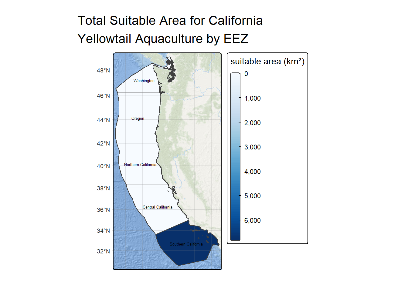 # Use function for California Yellowtail aquaculture zoneeez_area_zone(eez_data = eez, depth_data = depth, sst_data = sst, min_temp =15,max_temp =22,min_depth =-3, max_depth =-300, species_name ="California Yellowtail")